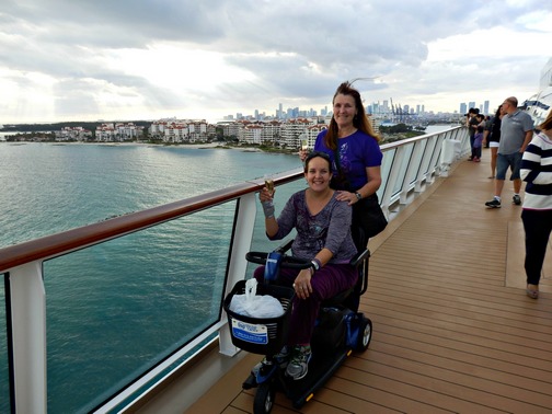 We had an accessible cabin onboard the ship. The door opened automatically, the entire suite (including bathroom area) was large enough to accommodate the scooter, and there was a ramp so that Carrieanna could enjoy the view from the balcony.