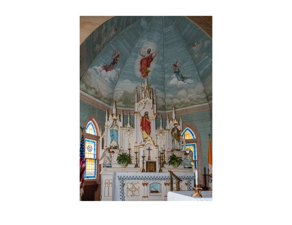 Built in 1912, this white wood-frame church is built in the shape of a cross. Inside, the ceiling behind the altar depicts the ascension of Jesus amid angels; statues of saints are found throughout.